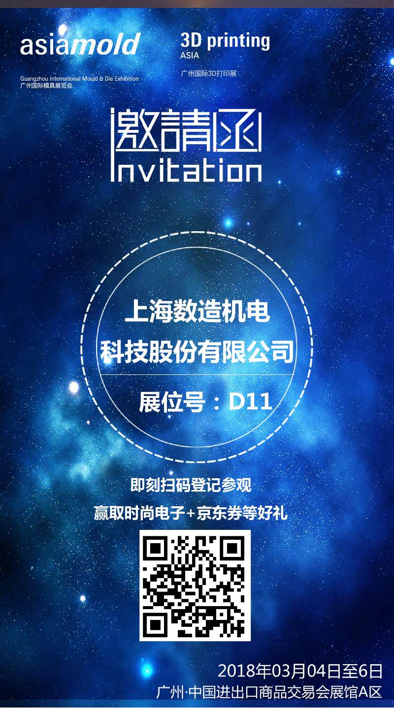 上海數(shù)造將亮相第十二屆“廣州國際模具展覽會(Asiamold)”,上海數(shù)造的發(fā)展道路離不開您的支持與肯定。2018年3月4日—6日,廣州·中國進(jìn)出口商品交易會展館A區(qū)D11號展位,恭候您的到來。